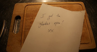 When I came home, feeling a little like someone from an Austen novel, the house was dark and silent except for the whirring of the dishwasher. This heartwarming note lay on the kitchen counter:
